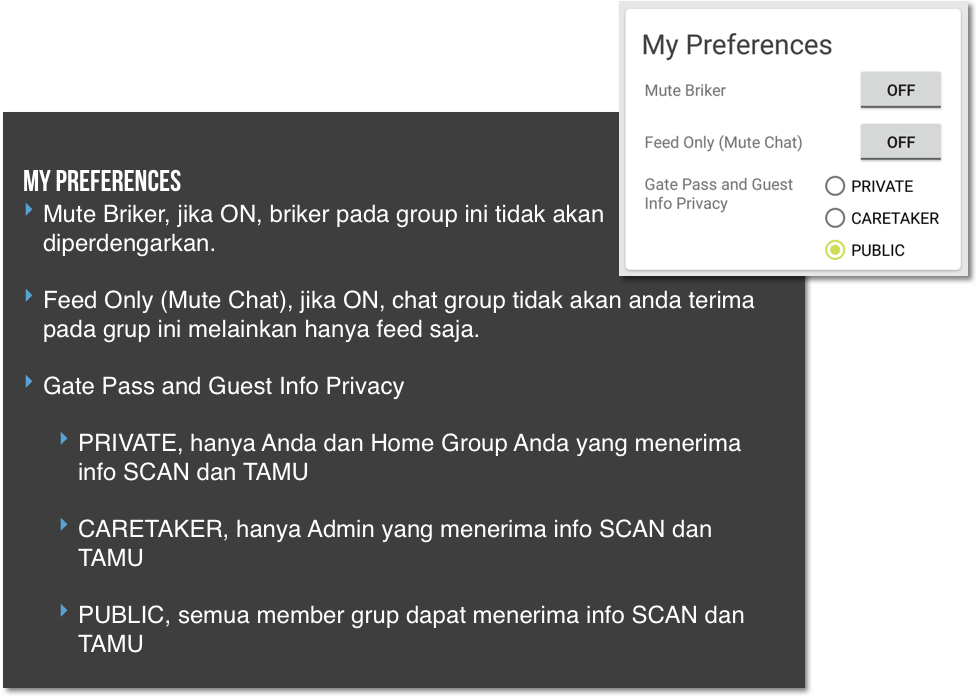 Fitur ini lebih banyak menyangkut aktifkan dan nonaktifkan fitur Tamu dan Patroli. Berguna jika hanya menggunakan grup untuk komunikasi biasa.
